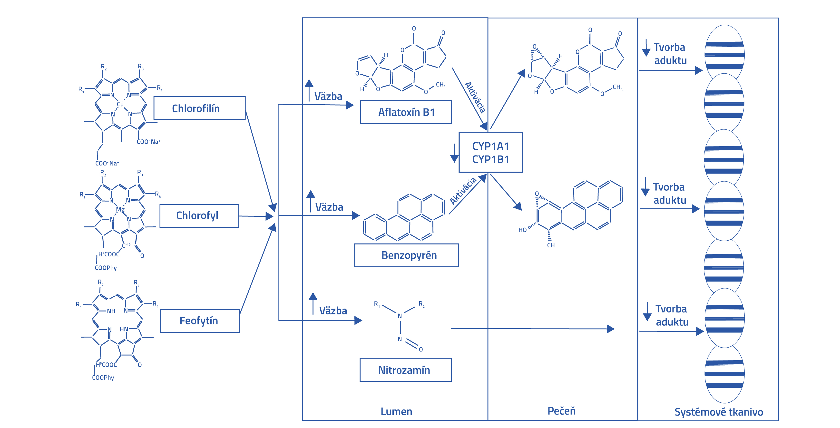 Odchytávací (trapping) efekt chlorofylu a jeho derivátov voči xenobiotikám (tu aflatoxín B1, benzoapyrén, nitrozamíny). Chlorofyl je funkčný ako v pre-, tak post-absporpčnej fáze. V preabsorpčnej fáze znižuje celkovú biodostupnosť xenobiotika, v postabsorpčnej fáze znižuje následnú mutagenitu prostredníctvom enzýmovo riadenej deregulácie väzby na DNA (prevzaté podľa Hayes and Ferruzzi, 2020).
